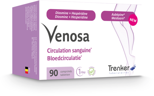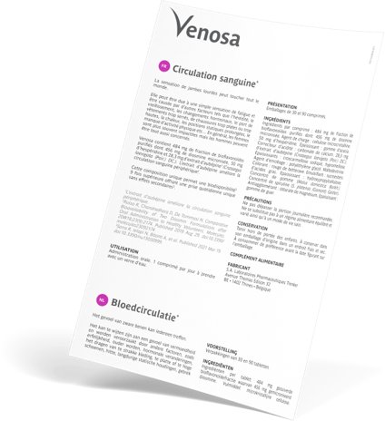 Venosa contient un extrait d’aubépine (Crataegus laevigata (Poir.) DC.) qui contribue à une bonne circulation sanguine1 ainsi que de l’hespéridine et une fraction de bioflavonoïdes purifiés dont 456 mg de diosmine micronisée de 3ème génération3.